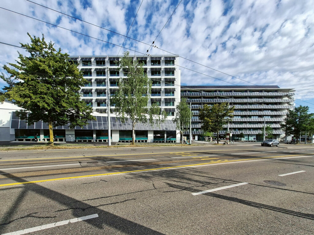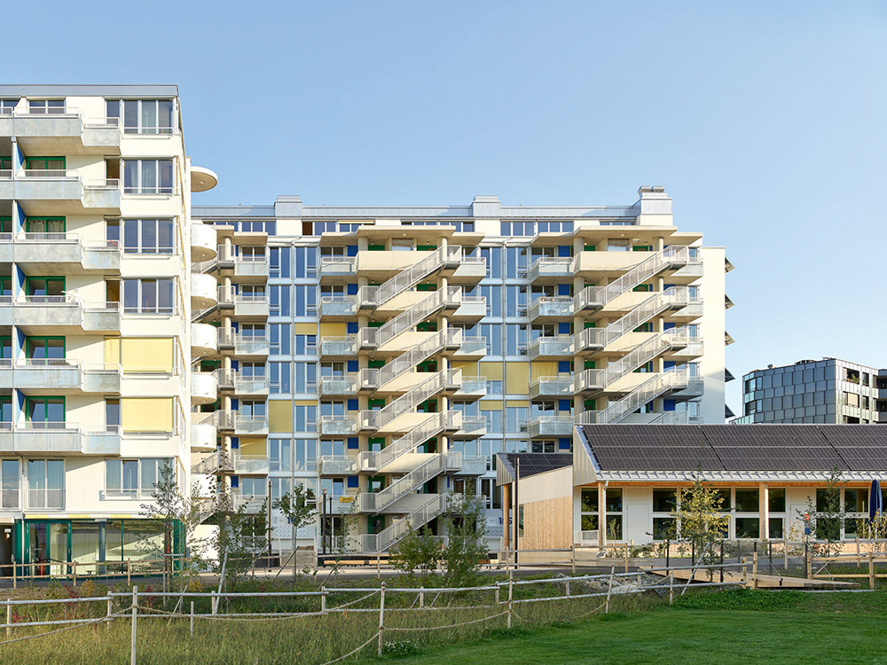 Die Wohn- und Gewerbesiedlung Guggach beim Bucheggplatz in Zürich-­Unterstrass ist Bestandteil einer Arealüberbauung an einer gut erschlossenen Lage, zusammen mit einer Schulanlage und einem Park. Die in die Fassadengestaltung integrierte PV-Anlage deckt einen Grossteil des eigenen Strombedarfs. Ein Mobilitätskonzept trägt zur Energieeffizienz der autofreien Siedlung bei.