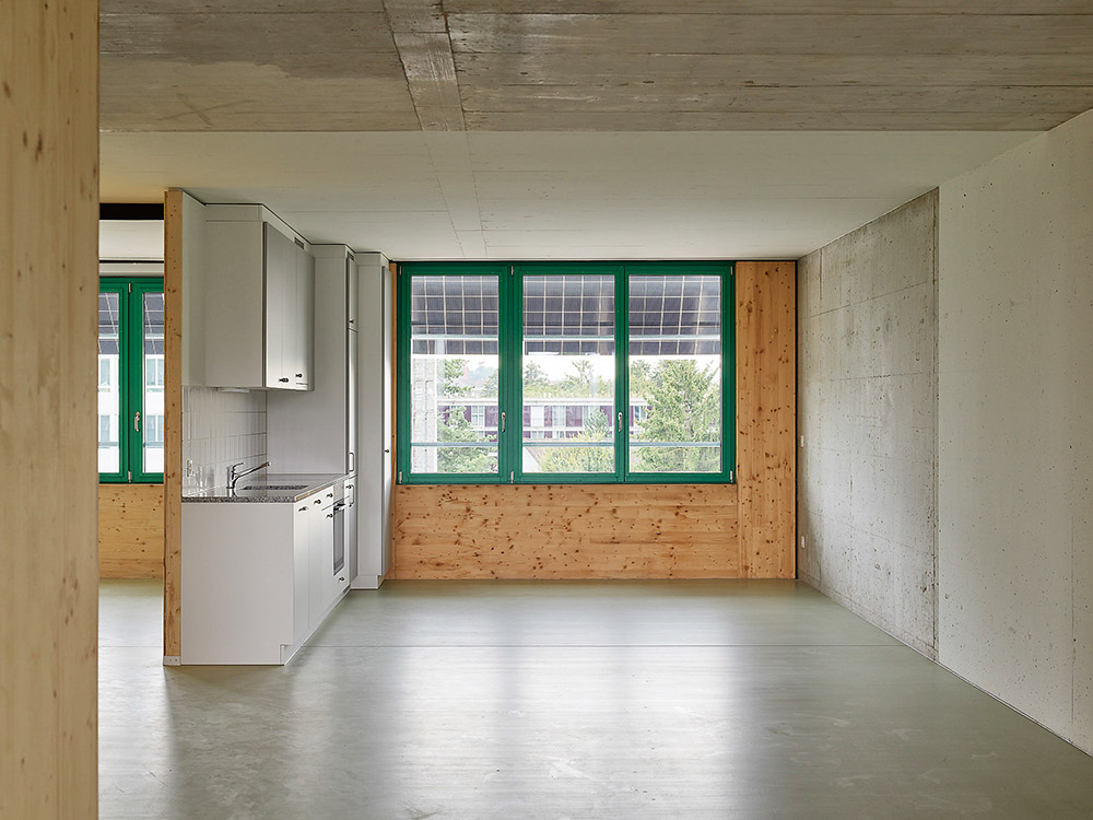 Grundsätze des kostengünstigen Bauens durchdringen die Architektur. Gleiche Wohnungen wurden übereinandergestapelt, sodass Kräfte und Installationen ohne Versprünge geführt werden konnten und Nutzungseinheiten mit flexiblem Ausbau resultierten. Das beheizte Volumen wird mit Gebäudetiefen von etwa 12 und 13,5 Metern von einem gerade verlaufenden Dämmperimeter umschlossen. Die innere Organisation der ­Wohnungen ermöglichte effiziente Spannweiten von 7 und 7,9 Metern für eine Schottenstruktur. Die gewählte Schottenbauweise liess sich schnell und kostenbewusst realisieren. Kostenrelevant waren auch der Verzicht auf eine unterirdische Einstellhalle, günstige Kompaktfassaden, reduzierte Oberflächenbeschichtungen in den Innenräumen, Monobeton-Deckenplatten für die vorgelagerten Bauteile oder serielle, einfache Metallgeländer.