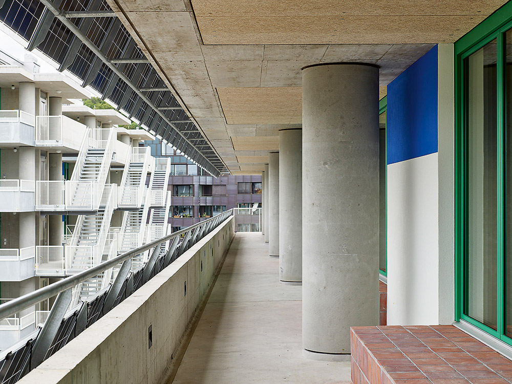 Die PV-Bänder des Laubenganghauses betonen die Horizontale vor den kräftigen Natursteinstützen in der Tiefe. Die leichte Auskragung bildet ein Vordach für den Laubengang. «Die architektonische Komposition aus ganz unterschiedlichen und doch aufeinander abgestimmten Bauteilen erzeugt eine stadtbildprägende Platzfassade – eine Eigenschaft, die Laubenganghäusern und PV-Standardmodulen in der Regel abgesprochen wird», steht im Bericht des Entwurfsteams. Diese Module treten nicht nur als Brüstungsbänder in Erscheinung, sondern auch als Vordächer, Sonnenschutz oder aufgeständertes Schild.