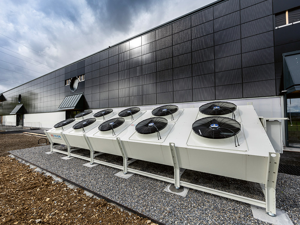Eine wichtige Rolle im Energiemanagement spielt die Hybridbox. Sie wird als «Herzstück» des energetischen Konzepts bezeichnet. Sie ist quasi die eierlegende Wollmilchsau der Gebäudetechnik: In ihr fliessen die Informationen zum aktuellen Energiebedarf (Wärme, Kälte und Strom) zentral zusammen. Sie erzeugt Wärme und Kälte und kann je nach Bedarf Strom produzieren oder Strom nutzen. Mit ihren sechs gestuft zuschaltbaren Wärmepumpen sowie einem Blockheizkraftwerk, auch bekannt als Wärme-Kraft-Kopplungsanlage (WKK), deckt die Hybridbox die diversen und sich dynamisch ändernden Bedürfnisse ab. Zudem erlaubt sie es, zeitnah auf volatile Strompreise zu reagieren: Sind diese hoch, wird der Strom mit der WKK generiert – fallen sie, wird die Wärmepumpe gestartet und die WKK schaltet auf Stand-by. Je nach Verfügbarkeit von erneuerbarem Strom aus der PV-Anlage kann dieser von der Wärmepumpe ideal genutzt werden. Andererseits lässt sich aber auch Strom exakt zu der Zeit erzeugen, wenn er am meisten benötigt wird (Winterstrom): Darin sieht man eine optimierte Wärmeerzeugung mit maximaler Wirtschaftlichkeit.